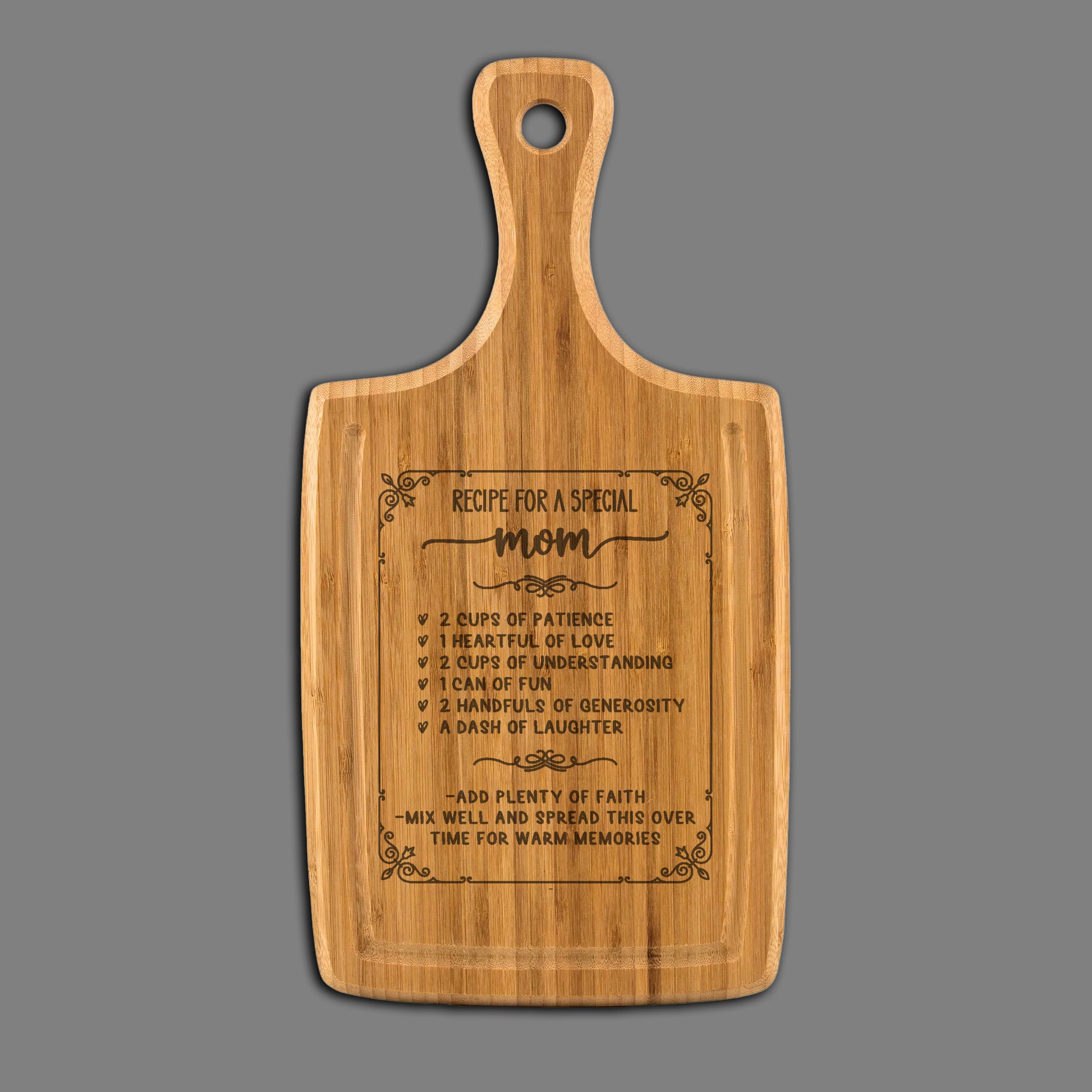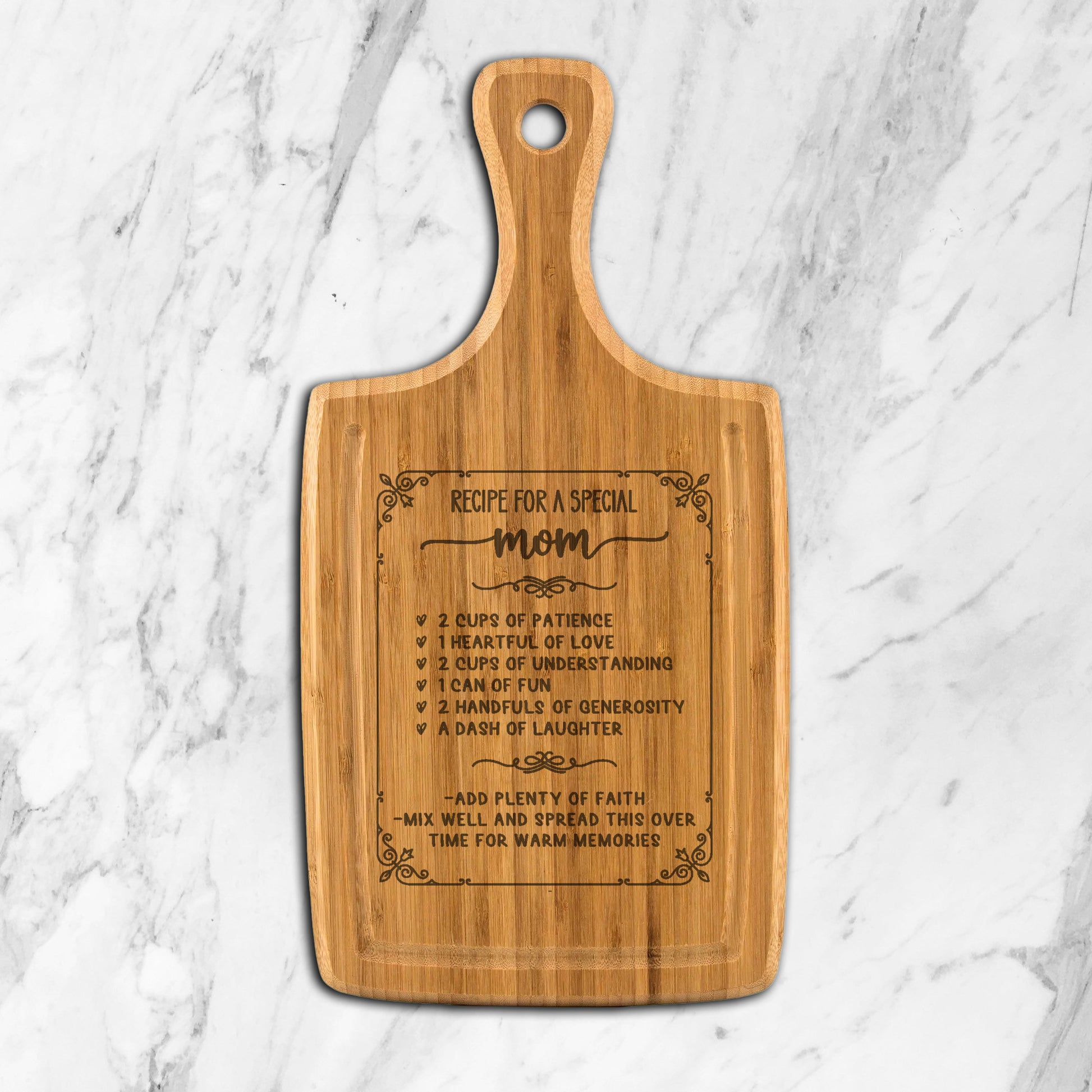 Mom Love Recipe - Cutting Board, Laser Engraved with Handle & Juice Grooves, 9"x17"