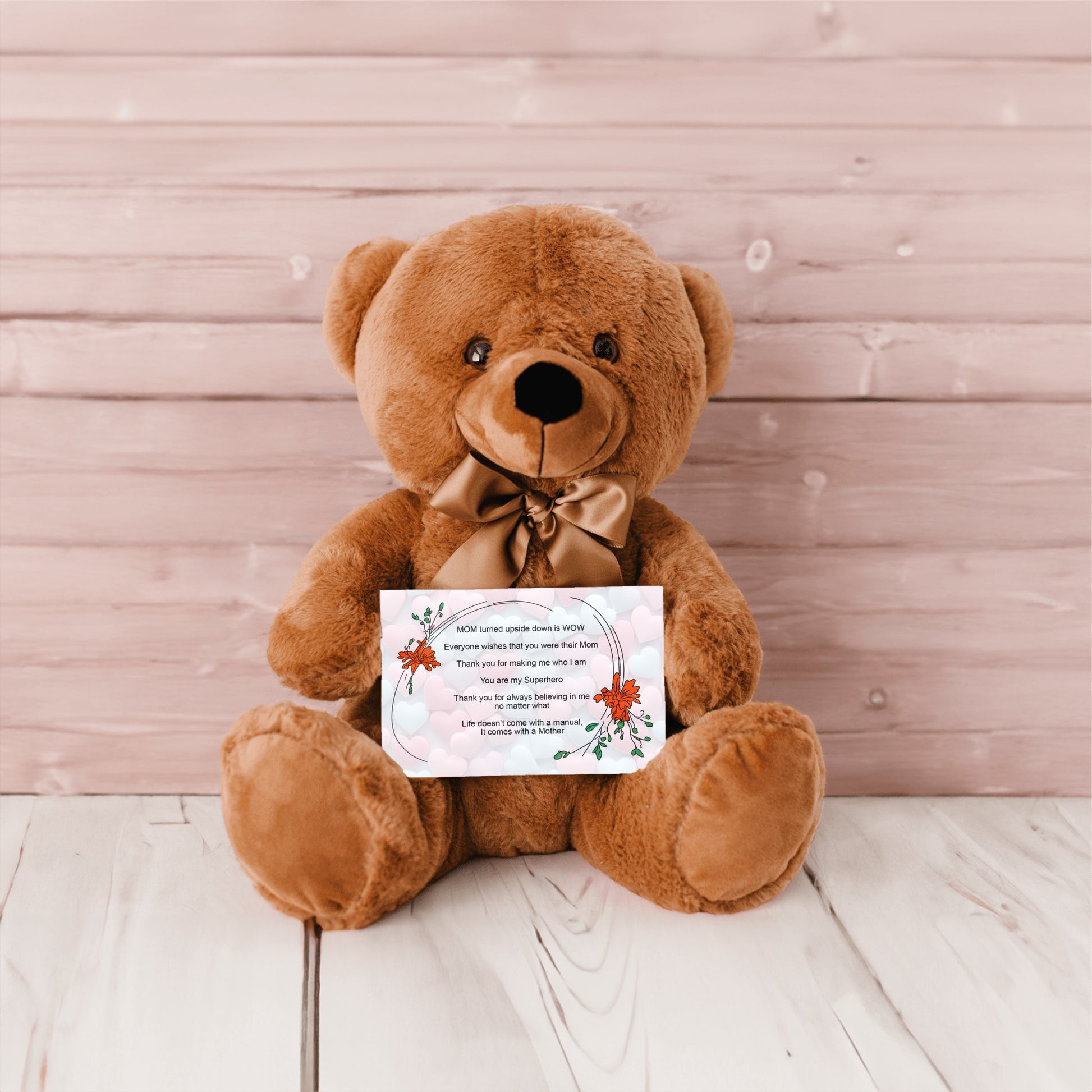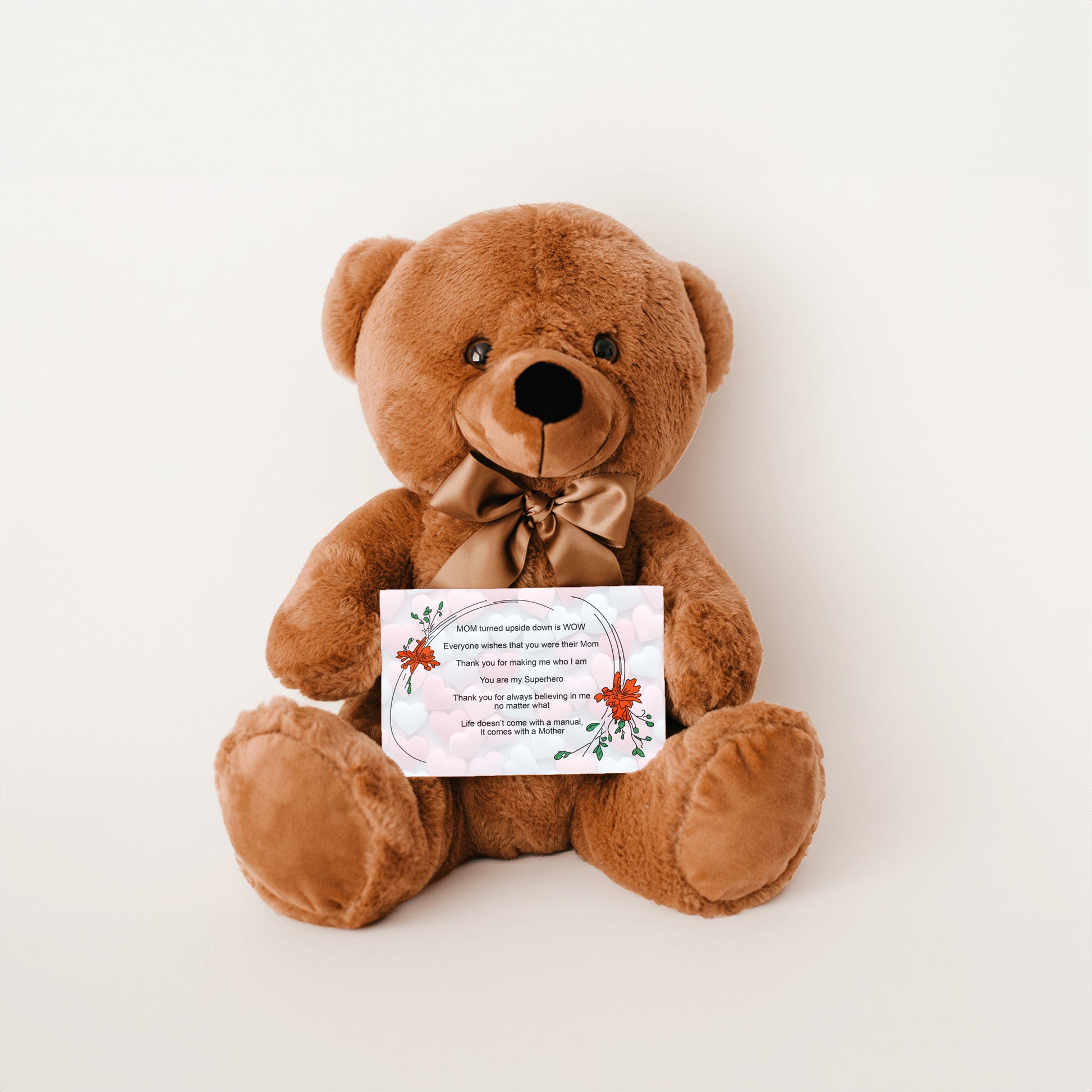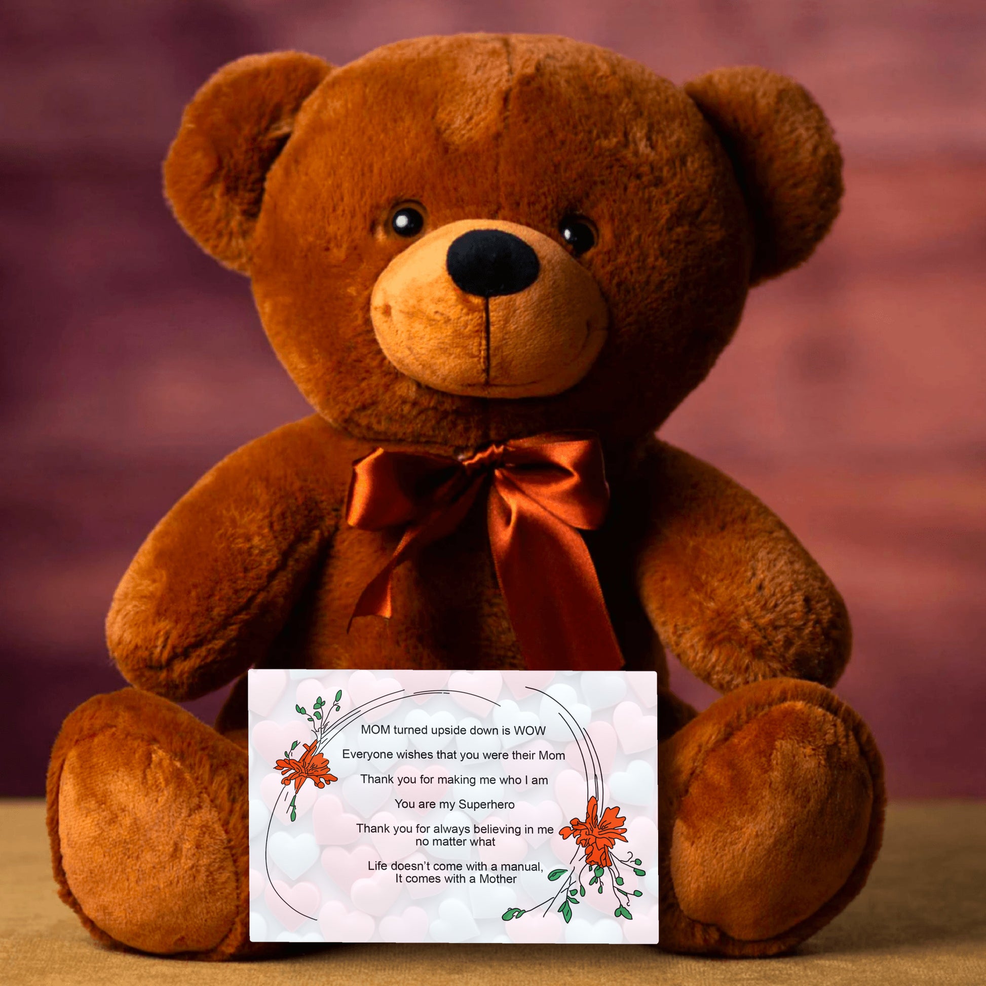 MOM Upside Down Is WOW - Teddy Bear With 6x4 Canvas Message Card. Heart background
